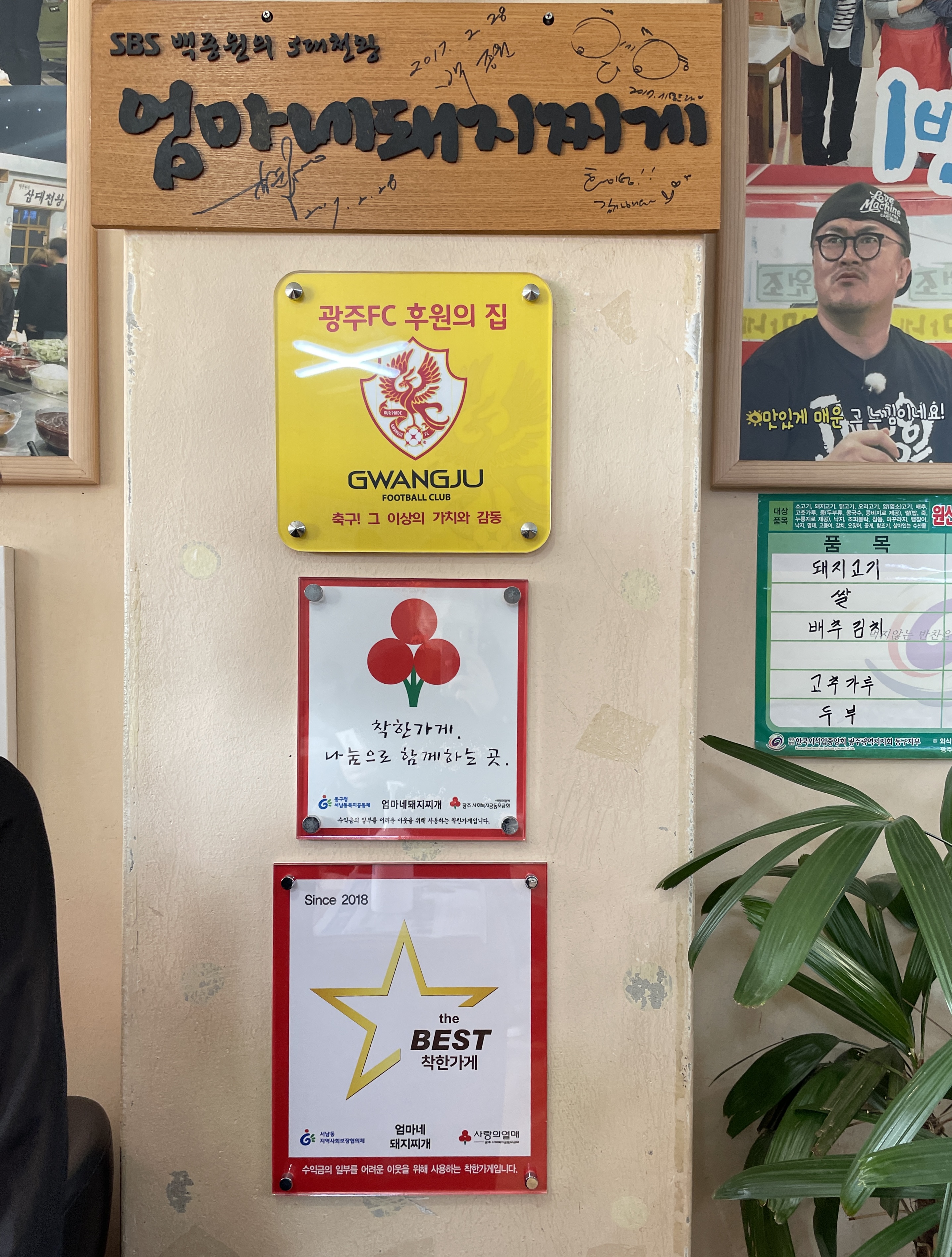 이런 것들은 또간집에서 나눠준 건지, 아니면 가게 주인들이 직접 만들어 액자에 걸어놓은 건지.