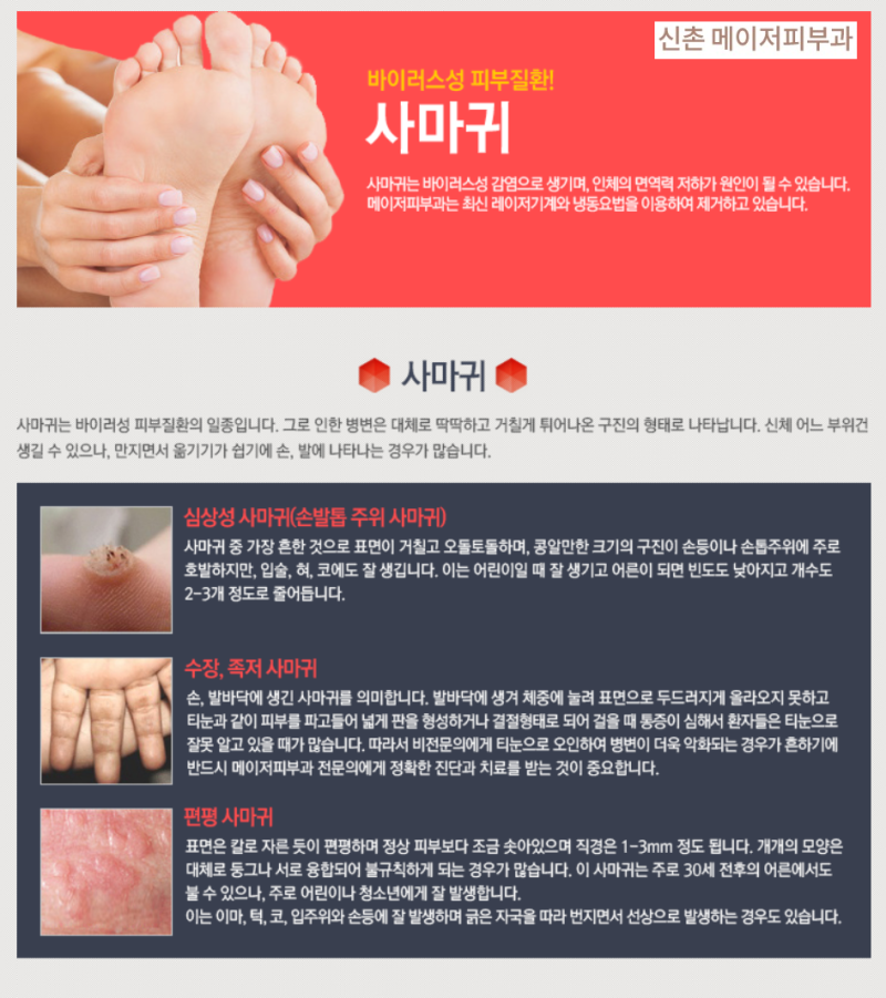 안녕하세요~ 오늘은 많은 분들이 피부과를 찾는 이유 중 하나인 #사마귀 치료 #티눈 치료에 대해 안내해 드립니다.#사마귀는 인유두종 바이러스에 의해 발생하는 일반적인 피부질환으로 #심상성 사마귀는 손가락 발가락, 손발 등에 호발하며 #족저 사마귀는 발바닥에, #편평 사마귀는 얼굴과 가슴, 목 등에 군집성으로 발생하기도 합니다.