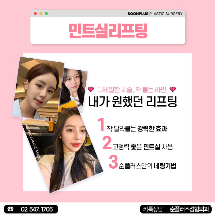 무절개, 무박리, 특수 돌기가 있는 실을 사용하여 늘어진 피부를 끌어올리고 주름진 피부를 곧게 펴서 지지해줍니다. 피부 속 특수 실이 녹아내리면서 피부를 잡아당길 뿐만 아니라 시간이 지날수록 서서히 분해 흡수되면서 콜라겐과 엘라스틴 생성 촉진! 피부 섬유화를 촉진하고 재생을 돕습니다. 여러모로 장단점이 있기 때문에 다른 라인의 특징과 장단점, 민트라인이 리프팅 잘 되는 곳을 알고 싶어 하시는 분들이 많습니다. 스레드 리프트를 다루는 의료기관의 경우 사용하는 방법과 재료가 다를 수 있습니다.