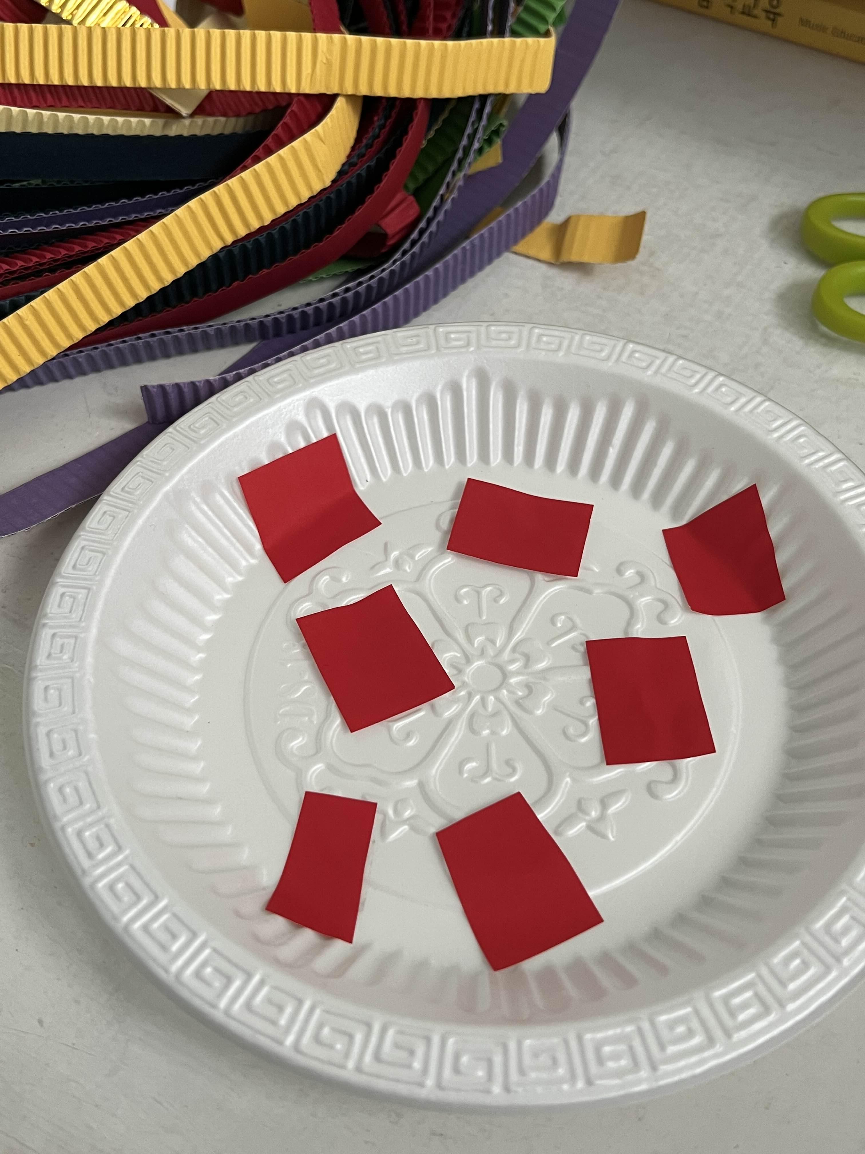 1. 빨간 종이를 오려서 종이 접시에 붙입니다.