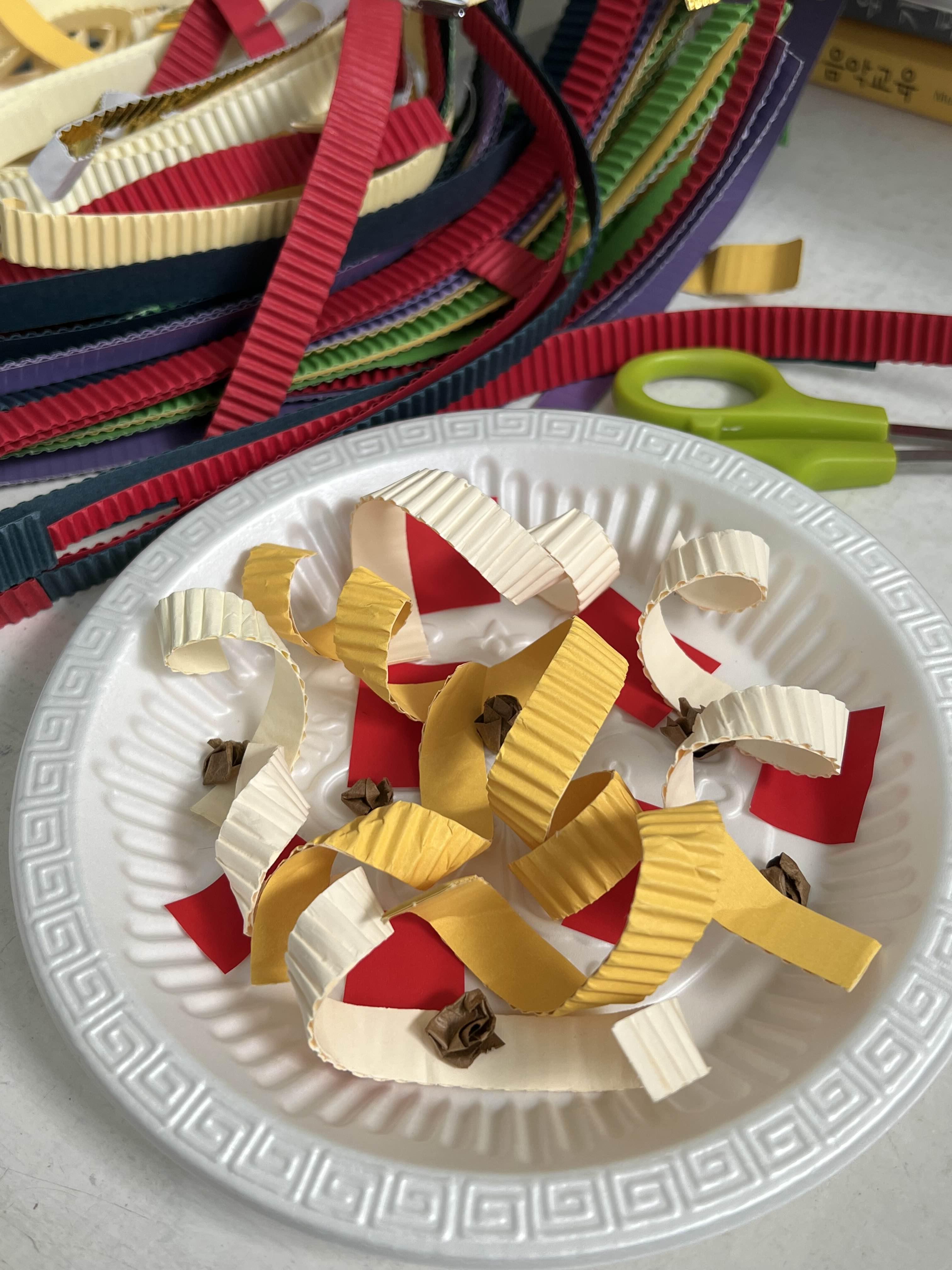 3. 골판지를 종이 접시에 붙이고 크라프트지를 구겨서 미트볼을 만들어주면 완성!